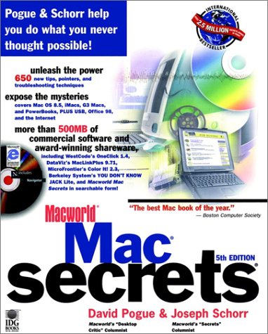 Macworld® Mac® secrets® 5th Edition "The newly definitive Macintosh reference work, replacing the venerable Macintosh Bible. Free download Macworld Mac Secrets books collection in PDF, EPUB, FB2, MOBI, and TXT formats. — The Washington Post "If you can only buy one book, you won't be sorry if you buy this one." —TidBITS "Mac Secrets should ship with every Mac that is sold." — Quill Services Web Book Reviews Completely revised and updated, this new edition of the international Macintosh bestseller brings you authoritative, thorough coverage of Mac OS 8.5, the red-hot iMac, USB, G3 Macs and PowerBooks, Office 98, and the Internet explosion — all with the expertise and humor you've come to expect from Pogue and Schorr! Overhauled and fatter than ever, this new edition packs over 650 new tips, productivity pointers, and troubleshooting techniques. Best deals ebooks download Macworld Mac Secrets on amazon.Complete with a CD-ROM crammed with over 500MB of software and shareware, Macworld Mac Secrets, 5th Edition, will keep you — and your Mac — smiling! 100s of Mac Secrets Revealed and Mac Myths DebunkedDouble your Web surfing speed (Ch. 25)Make any icon, file, or folder invisible (Ch. 1)Create a high-speed Ethernet network for (Ch. 35)Identify anything in your System Folder (Ch. 4)Keep your e-mail spam-free (Ch. 27)Make a PowerBook battery charge last 4 hours (Ch. 14)Marvel at Photoshop 5's secret keystroke list (Ch. 20)Automate your tedious tasks with AppleScript (Ch. 22)Exchange disks, files, and peripherals with Windows (Ch. 16)Use your fax machine as a scanner (Ch. 31)Troubleshoot almost anything (Ch. 36)Conversational AppleSpeak: USB, AutoStart worm, MacsBug, AppleScript, AOL 4, HTML, and much more!Software Bonanza! Over 100 programs, including commercial software and award winning shareware! A partial list: Action Files 1.1 P** (trial) Anagrams CanOpener 3.0 ** Chiral Color It! 2.3 ** CoolViews DemoGod * Desktop Patterns (Wraptures) * DiskTracker Escape Velocity Extensis PhotoBevel ** FileTyper FinderPop GoMac GraphicConverter Hi-Res Map * HTML Vocabulary Internet Explorer 4.01 Kaleidoscope Label Secrets Pro 3.0 * Mac Secrets Ultimate Bookmark List * Mac Libs MacLinkPlus 9.71** MacsBug Maelstrom Netscape Navigator 4.07 OneClick 1.4** Outlook Express Pogue's Song Spoofs* PopChar Pro (demo) QuickTime 3.0 QuickTime VR Movies ShrinkWrap (trial) Start-up Sounds: the Complete Collection * Stufflt Expander TechTool Typelt4Me Ultra Recorder You Don't Know Jack Lite * Plus Macworld Mac Secrets, 4th and 5th Editions, in searchable electronic form! * A Macworld Mac Secrets exclusive ** Commercial software Shareware programs are fully functional, free trial versions of copyrighted programs. If you like particular programs, register with their authors for a nominal fee and receive licenses, enhanced versions, and technical support. Freeware programs are free, copyrighted games, applications, and utilities. You can copy them to as many PCs as you like—free—but they may not include technical support.Author David Pogue emphasizes that MacWorld Mac Secrets is not for beginners or power users, but for "everybody in the middle." Instead of detailing how to do obscure tasks that only a few will want to know, Pogue divulges secrets and shortcuts that will help and intrigue the everyday Mac user. You won't find any information on Systems 7 and 7.1 in the fifth edition of this guide; you'll have to refer back to the fourth edition for that information. However, this book does feature extensive coverage of OS 8.5 (and new secrets for OS 8 and 8.1), the iMac, digital cameras, AppleScript, and other updated topics. The included CD-ROM contains the entire printed version of the book in a searchable format, plus hundreds of dollars worth of commercial software--such as MacLinkPlus, OneClick, and ColorIt--for no extra cost. This guide begins by identifying what all the System software that came with your Mac does and tells you what you need to keep and what you can delete. The next section covers the inner workings of the Mac and provides a model-by-model outline of what the older Macs are now worth and how they can be upgraded for maximum performance. The third section will probably be the most helpful to the majority of users: it shares all of the shortcuts and secrets within common Mac applications. A new section of this volume covers Internet-related issues such as modems, browsers, and e-mail. MacWorld Mac Secrets closes with definitions of all the possible attachments for your Mac and instructions on how to install them. An appendix lists all of the software on the companion CD-ROM and explains what it does. This serves as a fine reference book for the dedicated Mac user. --Cristina Vaamonde Download Macworld Mac Secrets with free ebook downloads available via rapidshare, mediafire, 4shared.